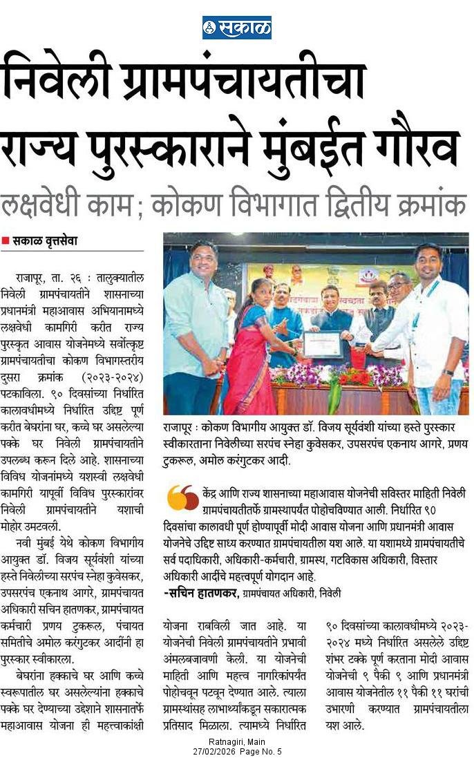 ग्रामपंचायत निवेली निर्मल ग्राम , लोकराज्य गाव , तंटामुक्त गाव पुरस्कार प्राप्त जन्म , मृत्यू , विवाह नोंदणी कार्यालय